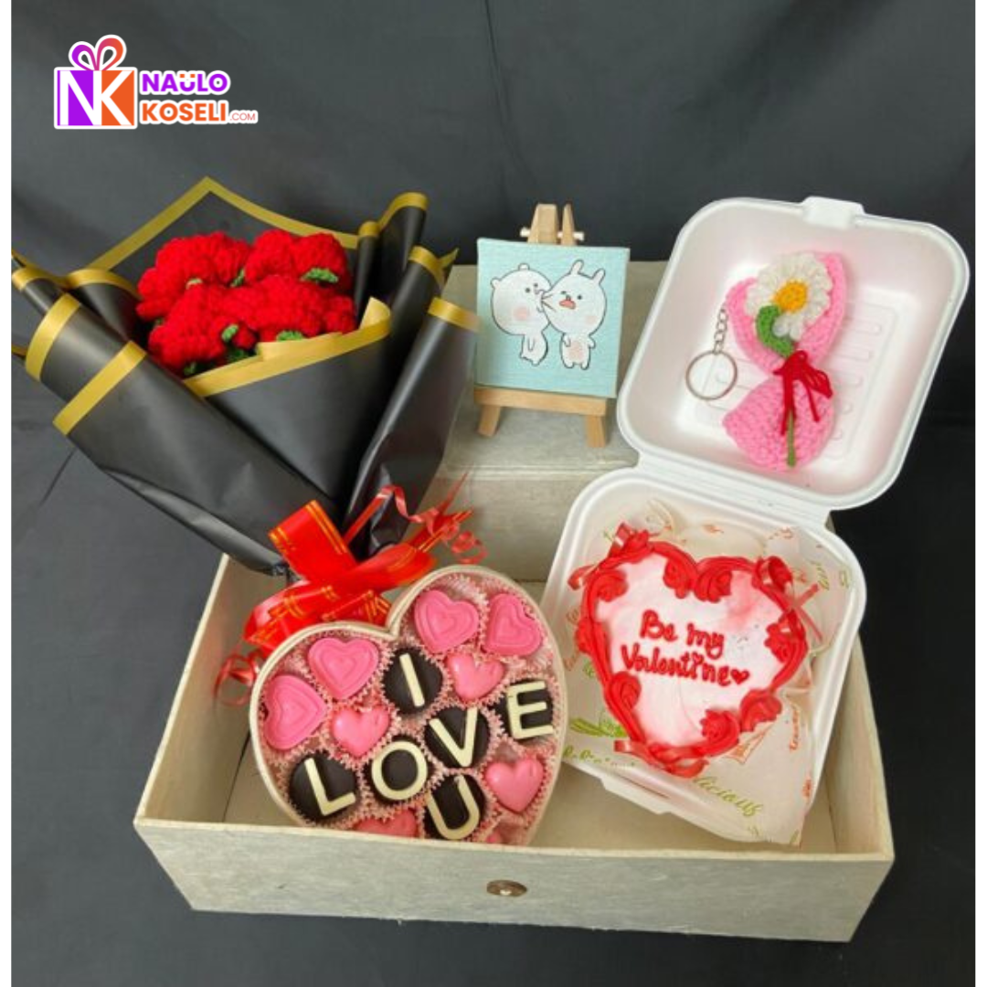 Inside this charming set, you’ll find a cute keepsake keychain, a handmade crochet rose bouquet that never fades, a mini canvas perfect for photos or messages, a customized “I Love You” chocolate, and a freshly baked Valentine bento cake. Each piece adds warmth and meaning, creating a beautiful balance of romance and celebration.